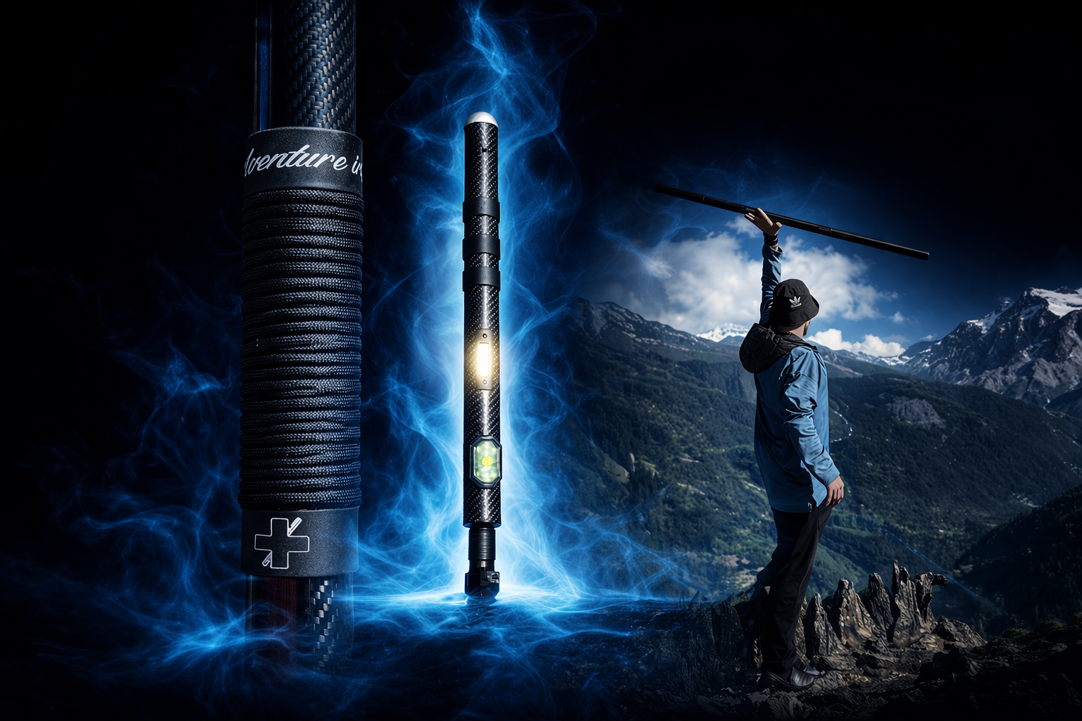 Cette invention, c’est 25 accessoires spécialement choisis pour te rendre plus autonome et autosuffisant durant tes aventures en plein air, le tout harmonieusement rangé dans un bâton de marche en fibre de carbone.
