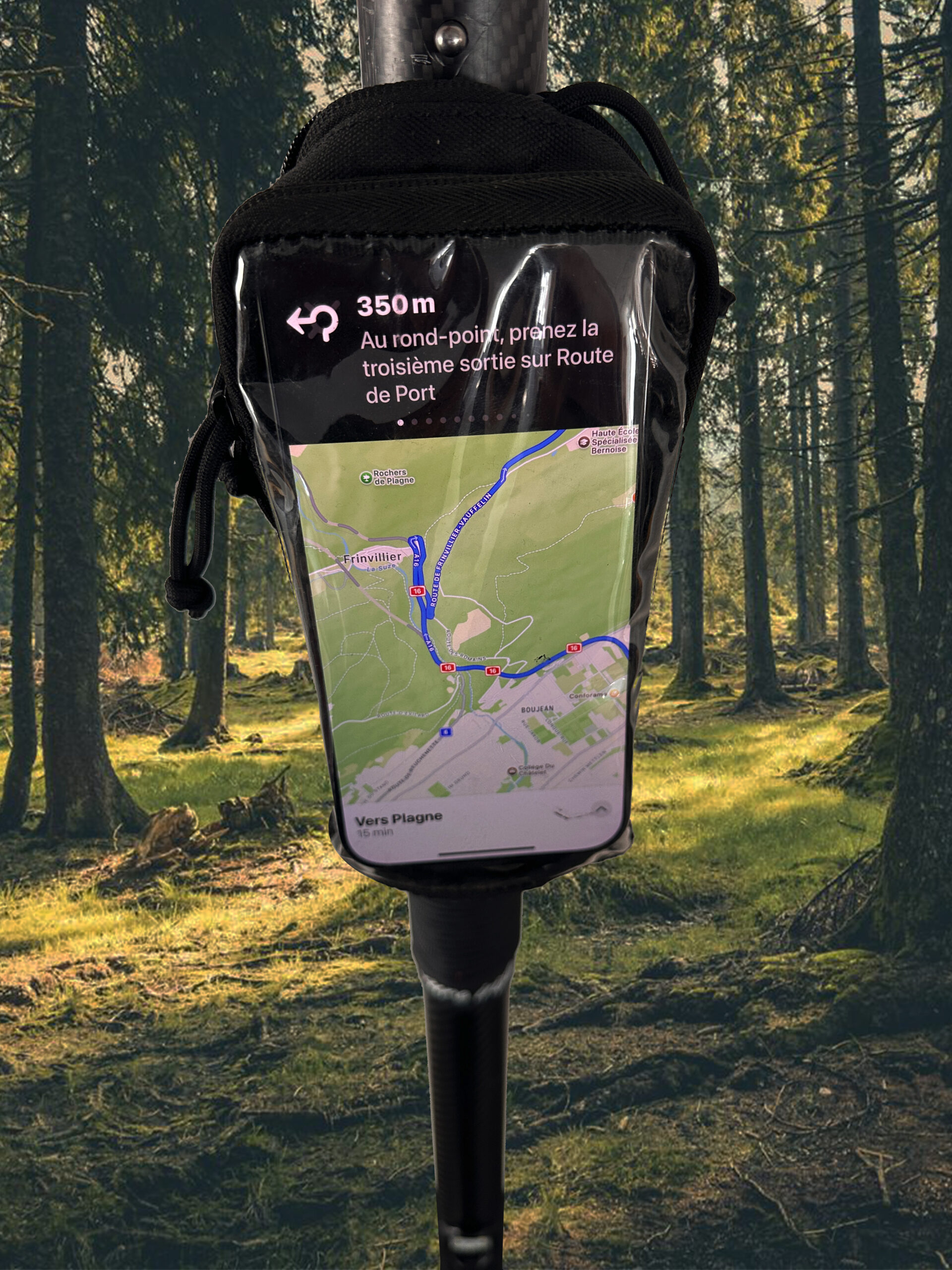 Fixez la poche avec des sangles et insérez le parapluie grâce au système magnétique — même avec des gants.
